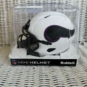 Matte white mini helmet with black & purple Vikings logo.