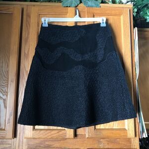 The RAOUL Intarsia Waves Wool Blend A-Line Skirt in size 4 is a stylish and versatile piece perfect for various occasions. Made from a wool blend fabric with a fleece/velour texture, this knee-length skirt features a solid black color with intarsia waves accents. It has a zip closure and is lined for added comfort. Ideal for the winter and fall seasons, this designer skirt exudes an academia-inspired vibe, making it a great addition to any woman's wardrobe.
