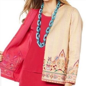 Be you, the best most stylish you too. This short jacket features a beautifully embroidered textural trim sure to go with so many things in your closet.