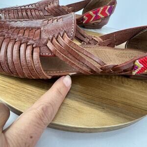 RARAMURI Mexican Beaded Hand Made Leather Woven Cognac Huarache Sandals Size 10