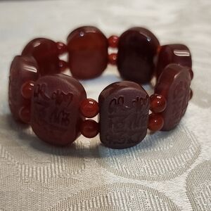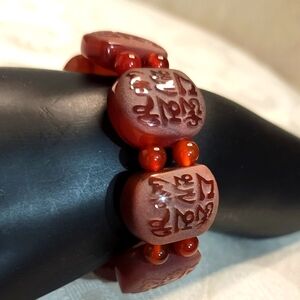 RARE 1970s HSUI Natural Red Jade Stretch Bracelet – Hand Carved Chinese Characters