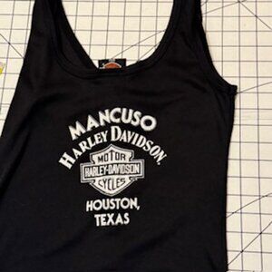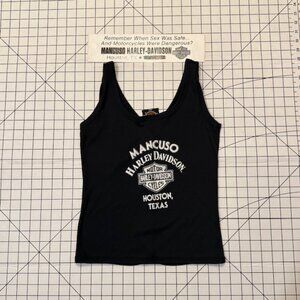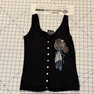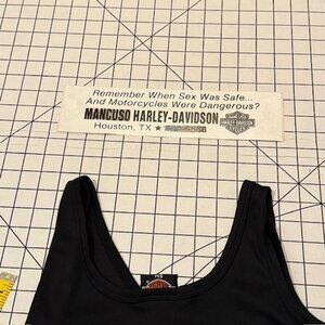 RARE 1991 MANCUSO HARLEY DAVIDSON TRIBAL DESIGN WOMEN'S TANK TOP SZ SM AND BUMPER STICKER. This is snap front tank-top with 2 inch wide shoulder straps. The tank-top is in great pre-owned condition; no stains, tears, or holes. The bumper sticker is in the condition you see in the photo.