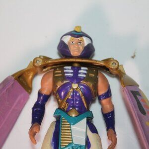 Introducing the RARE 1995 Peak 4.75" Galoob LGTI Action Figure from the Dragon Flyz series. This collectible figure is a must-have for enthusiasts and collectors of 90s action figures. The figure features vibrant colors with a combination of purple, gold, and teal accents that highlight its detailed armor and dynamic design. Its wings are uniquely crafted with decorative elements and are attached on either side to enhance mobility and playability. The craftsmanship is a testament to the era's toy-making quality, with durable materials ensuring longevity. Perfect for display or imaginative play, this action figure captures the nostalgia of the Dragon Flyz series, making it a fantastic addition to any collection. Ideal for Galoob and Dragon Flyz fans or anyone looking to recapture a piece of 90s magic. Don't miss the opportunity to own this rare piece of action figure history!