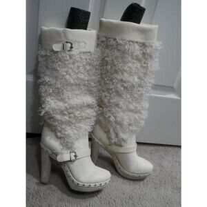 Runway photo is of the short boots, these are the knee high boots!!! VERY RARE Here is a gorgeous pair of 2006 Ready to wear Fall Dolce & Gabbana Fur boots! I bought them & my calves were too big so they sat in my closet for years!! They were in an Ad for Saks, it was a blond with an ivory wool miniskirt, sweater, huge ivory scarf & these boots. I saw it & ran to buy them, I LOVE these but they just don't work for me. Never been worn, they are buttery soft lambskin ivory leather, with curly lamb fur, rhine stone trim, a couple fell of, I don't know how. as you can se by the bottoms they have never been worn. The sole is whitewashed wood. Tagged a 38, I think that is a US 8 but make sure before you buy!! I paid $2400 for these boots about 16 years ago. No box