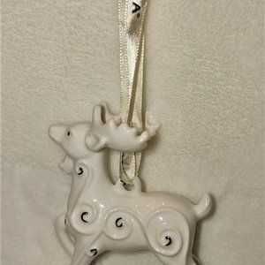 White porcelain reindeer with silver accents, satin hanging ribbon, gift box, and charm gift bag.