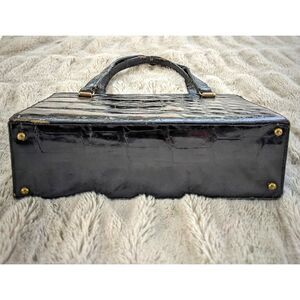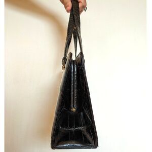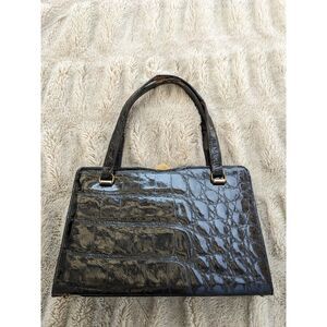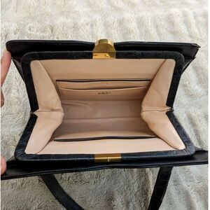 STUNNING 1950s Bellestone alligator bag! High sheen black, very mid century modern & architectural with the lovely dip at the middle top & the (very unusual for Bellestone) 3 compartment design! Additionally there are 2 handles, adding to the rarity factor.
