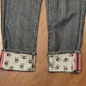 RARE 7 FOR ALL MANKIND SKULL-CUFFED LOW-RISE CAPRI SZ 28. Dark wash. Super cute and edgy jeans are in great pre-owned shape, no tears, holes, or stains. These are low-rise capris so look at measurements carefully.