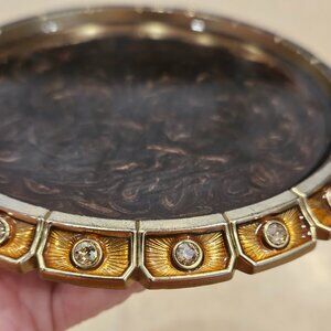 This is an AUTHENTIC Vintage Jay Strongwater Jungle Drink Coaster. This was purchased from Neiman Marcus. This is from the RETIRED Jungle collection. The coaster is accented with a crystal edge. The pattern is done in an enamel. The metal has a gold finish and accented with Swarovski crystals. The round coaster measures approximately 4 3/4"W (from left to right.) It measures 3 7/8" W (from left to right on the interior of the coaster. it has a gold-colored metal bottom and the Jay Strongwater logo in the center. This is pre-owned and has been used. It comes from a non-smoking home. There are no missing crystals. There is significant wear to the enamel finish...particularly, in the center...there is wear and scratches. There is a brown dot of enamel on the backside gold metal...see pictures. Pictures of actual item.