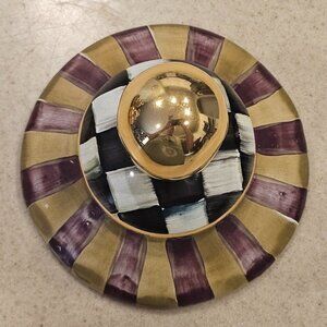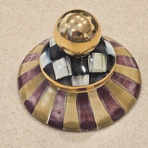 This is an AUTHENTIC RARE MACKENZIE CHILDS ARGYLE CANISTER TOP LID for the Globe canister. LOVELY and CLASSIC Argyle Harlequin Plaid design on this piece. This is ceramic and HANDMADE in Aurora, NY and HAND-PAINTED. This was purchased directly from Mackenzie-Childs. RARE and RETIRED and NO LONGER AVAILABLE. CLASSIC and WONDERFUL addition to any kitchen, table, office, or whatever you desire!! It measures approximately 3 7/8"L (from top to bottom) by 5"W (at widest part.) Handmade, hand-painted ceramic with gold lustre embellishments. It has hand-painted. Handcrafted in Aurora. Hand washing is recommended. This is NOT Dishwasher safe nor microwave safe. Comes from a non-smoking home. This is individually handmade and hand-painted...thus, no two are exactly alike. This was NOT a barn sale purchase. This is sold AS IS. There is a chip on the underside exposing the terra cotta and ceramic. Pictures of actual item.