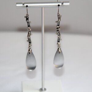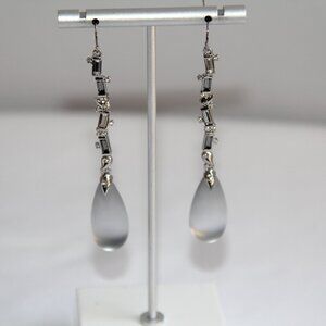 RARE Alexis Bittar Crystals and Lucite Drop Earrings. Alexis Bittar Hand- Carved and Hand Painted Signature Lucite Earrings That Defines This Iconic Designer. The Elongated Lucite Drop Shape is White /Very Light Grey Tone with A Luminous Pearl-Like Reflection. The Crystals Are Set on Rhodium Plated Silver with A Combination of Grey and Clear Baguettes and Round Clear Crystals Throughout That Catch the Light For an Amazing Sparkle. Alexis Bittar Signature Logo. Size 3 ¼” drop length x ½” width on French Wires. These Earrings Are the Perfect- Goes with Everything- Color. Kind to Your Earlobes weigh 9 grams.