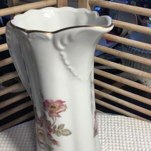 This is a white 20 ounce pitcher or pouring vessel by Gerold Porzellan of Germany in pattern GDR2. It is white with pink flowers and gold trim on the top and bottom rims. It is marked as shown.