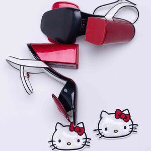 Step out in style with these ASOS x Hello Kitty Glitter Block High Heels, an ultra rare find that combines playful charm with a touch of glamour. In the classic Hello Kitty colors, red, black, and white patent leather straps with buckle are adorned with a 5 inch red glitter block heel, offering a delightful sparkle with every step. Perfect for both formal occasions and fun outings, the interchangeable easy snap on embellishments can be matching Hello Kitty faces, her iconic bow, or mismatched - it's totally up to you!
