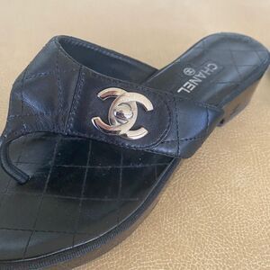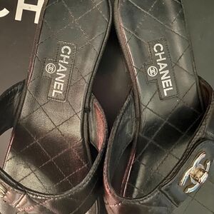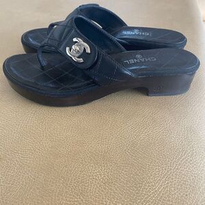 RARE Authentic Chanel Black T-Strap black platform sandals silver turn lock size