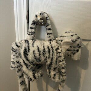 B J Toys Snow Leopard Purse, Shoulder Strap Hand Straps Zippered Pocket 4" Deep; Beige Chest & Tummy, Brown Bead Eyes, B J Toy Co Inc, Very Soft, Huggable; Washed and Sanitized, Ready to be Loved; Shoulder strap is removable. Fuzzy pink nose & Embroidered Mouth; Excellent Used Condition, No stains, rips, or tears; See all photos for condition & descriptions; Ships Quickly, Monday - Friday (Except National Holidays) 1 lb 4 oz. 14" long 7" high L103