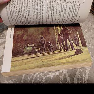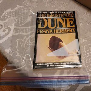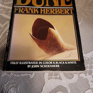 1978 edition of "The Illustrated Dune" by Frank Herbert with illustrations in color and B&W by John Schoenherr. Few of these remain in existence, and even the nicest of them are a bit rough. This copy is in fair-good (F-G) condition, with a shelf-worn cover which has a small rip at the top (see photos). The interior of the book appears almost untouched, with slight yellowing evident on the page edges. The spine appears uncreased (see photo), which is unusual for a book this age. Other than the one exception noted, the book displays wear consistent with shelf storage/wear for a book its age (44 years).