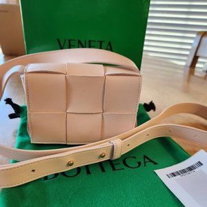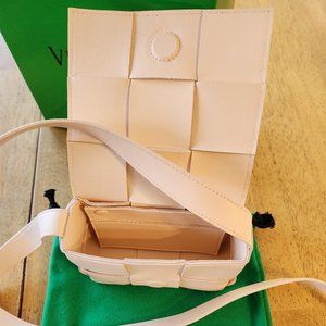 From Italian designer Bottega Veneta, we offer New In Box their luxurious Mini Cassette cross-body bag in the RARE Melon-Washed Gold. This item retails for $1,250, and details include: