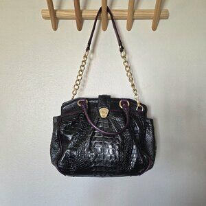 RARE Brahmin Adora Black & Purple Croc Embossed Leather Satchel Gold Chain
