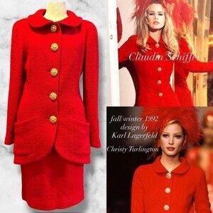 This is an authentic Chanel Vintage Fall/Winter 1992 Runway Parisian Red Gold Buttons Boucle Tweed Jacket and Skirt Suit. This is an extremely rare and iconic tweed suit, worn by supermodel Claudia Schiffer on the Fall/Winter Collection in 1992 by the late Karl Lagerfeld. This is an Iconic RARE Collector's Piece, a beautiful masterpiece with 24K Gold Plated Buttons and scarlet red luxurious wool blend.