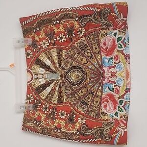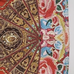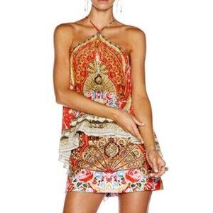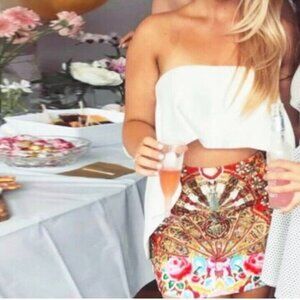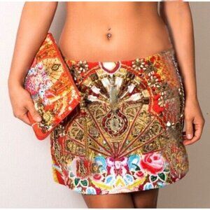 Super Rare Piece from Camilla and very coveted! The Camilla Cameos Dance Mini Skirt encapsulates a sea of vibrant orange, gold and powder blue. This statement piece is adorned in shimmering crystals, beads, sequins and rhinestones. Size Small.
