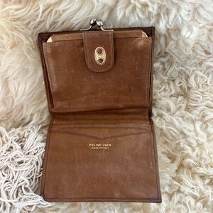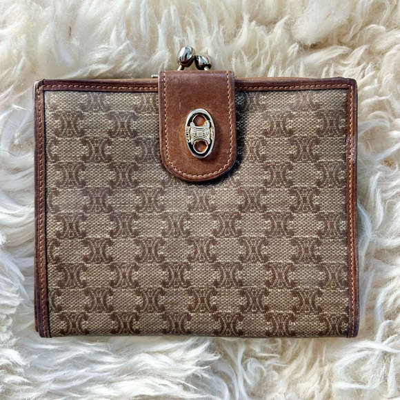 Elegant vintage Celine Macadam wallet. Features classic logo pattern. Secure clasp closure. In great condition- please see all photos. Has regular wallet compartment for cards and cash and a kiss lock section for coins- this exact vintage Celine wallet with these details is extremely hard to find.