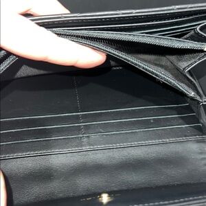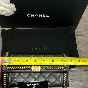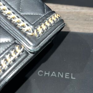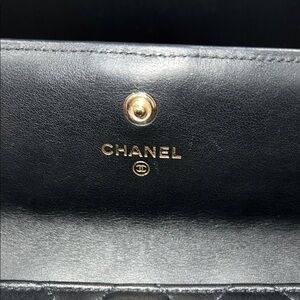 This exquisite gently used Chanel flap wallet features the iconic diamond quilting in luxurious black soft leather, complemented by a distressed gold-tone CC logo clasp and outlined by a distressed gold chain, Its compact design is perfect for evening occasions, offering a touch of elegance and sophistication. Size is approximate not exact. This is a rare stunning chanel. because it’s so pretty I used it also as a clutch bag. Does have some minor scuffing on some of the edges that is very light in color, it’s barely noticeable to be honest. Minor creasing from use. This is clean, comes with its box beautiful dust bag, and authenticity card . Will be verified by Poshmark for authenticity