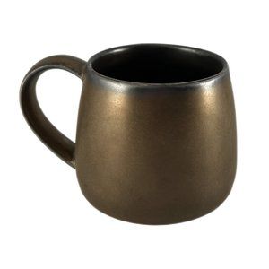 This unusual find from a Starbucks Roastery is finished with shimmery metallic bronze color that shifts with the viewing angle and features the Starbucks Reserve logo on one side. The bottom outside portion has a matte cement color. The entire interior has a dark, almost graphite reactive glaze finish, which also accents the rim and handle.