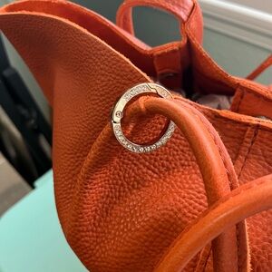 This is the large size, please see sizing photo. This very rare not available in stores orange Koi color is so amazing! Squishy leather orange bag great for travel or anytime. This bag is very unstructured and slouchy so fill it and let it shine! Beautiful pebbled leather.