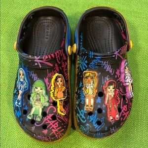 Crocs kids clogs, rainbow High cutie crush. Girls size 2J, sparkly gold bottoms, sling backs that move to become slide in’s, Vibrant kids featuring playful cartoon characters of cutie crush rainbow high. Pre-owned but much life left. These are a rare find and Perfect for adding fun to any outfit.