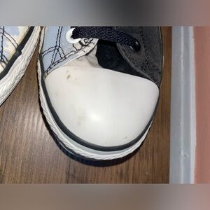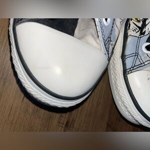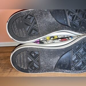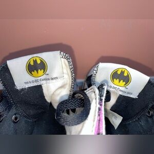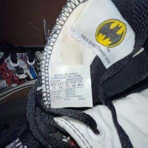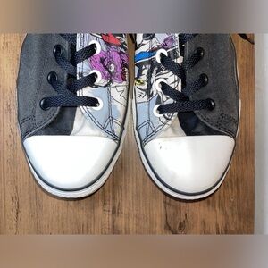 Turn heads and break necks with these ultra-rare Two Faced-themed Converse Chuck Taylors! Featuring bold, comic-inspired artwork straight from Gotham City, these high tops are a must-have for any collector, sneakerhead, or DC Comics fan. Classic black canvas with vibrant purple, yellow, and white Two Face graphics, these shoes are in great condition and ready to step up your streetwear game.