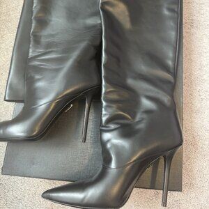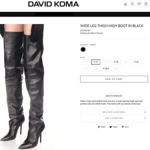 RARE and SOLD OUT DAVID KOMA WIDE LEG THIGH HIGH BOOTS SIZE 41 IT/ 11 US with a 4.25 inch stiletto heel and pointed toes. Statement boots with extremely nice soft leather and structure! Fully leather lined. The thigh high cut in wide leather is very fashionable as seen worn by celebrities. A hidden stretch panel is in the back for extra thigh accommodation. Perfect for upcoming Fall and Winter outings and holiday parties for perfect pairing with the David Koma black leather mini shorts or with other short mini skirts or mini dresses! Comes with original David Koma boot box. Retailed for $3000 USD from David Koma website and can be yours for less.