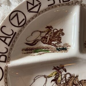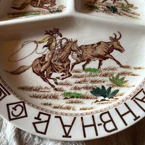 Designed and released by the Wallace China Company of Los Angeles in the 1940s, the Rodeo Pattern Dinnerware has become a cherished heirloom for generations. Each piece boasts a heavy roll rim and is meticulously crafted from genuine, break and chip-resistant china, ensuring durability and longevity RARE!!! See pics.