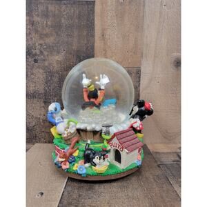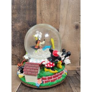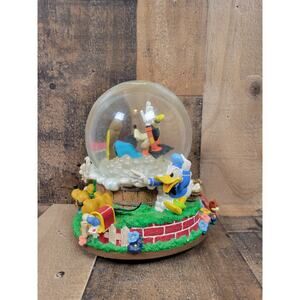Fair pre-owned condition, Globe does not wind up or play music, bucket is missing from top of snow globe, corner of pluto's house is chipped, hose sprinkler head is missing from Minnie's hand (see all pictures for more detail), smoke free home, ships quickly!