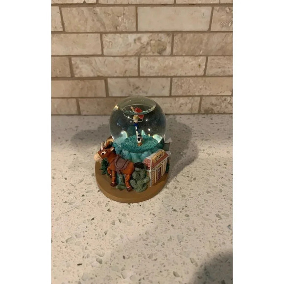 Rare Disney Pixar Toy Story 2 mini snowglobe featuring Jessie and Bullseye. Glitter in globe when shaken. Measures approximately 4"x3"x3". Bubble at top of globe, please see pictures. No chips or cracks. Used item in excellent condition. Comes from a smoke-free home.