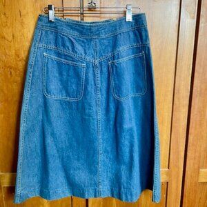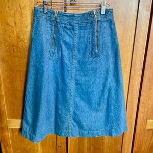 This vintage Faded Glory A-Line denim skirt features a unique design with double zipper accents, giving it a retro 70s vibe. The skirt is knee-length and has a distressed look, adding to its vintage appeal. The denim fabric is durable and stylish, perfect for casual or everyday wear. The skirt is in a regular size small and in a classic blue color, making it a versatile piece that can be easily styled with different tops and shoes for a fashionable look.