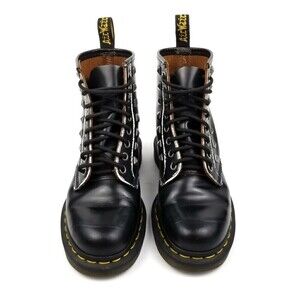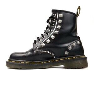 Generation after generation, our wearers have inspired us with enhanced, personalized takes on our footwear. Now customization is in our DNA. The DIY punk-infused 1460 Stud sees our iconic 8-eye boot subverted by an edgier aesthetic. Decked out with a strap, silver buckle and square pyramid studs, the boots are built from a mix of black and white for a dramatic, attention-grabbing contrast. Our signature yellow welt stitch and scripted heel loop mark them as Dr. Martens.