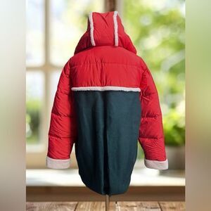 **( Green Felt Wool, Red/ Coral Quilted Puffer area, Fur trim slight red/pink tint)