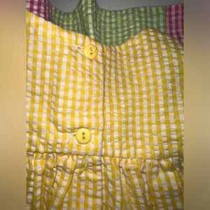 NWOT This charming dress features a square neckline and sleeveless design in yellow seersucker fabric, perfect for warm weather. Adorned with a bow on each shoulder and flip-flop appliqués above the hem. Made from a cotton/polyester blend with a comfortable polyester/cotton lined bodice, it's easy to care for.