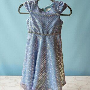 Knee length dress features shimmering iridescent fabric in shades of light blue and lavender with a metallic diamond pattern. The skirt flares gently from the waist creating a classic A-line silhouette. Perfect dress for a celebration, daddy/daughter dance or wedding.