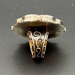 This is a piece that has presence and is sure to make a statement. Sterling and semi precious stones as well as decorative scroll work on the band. Sz 8