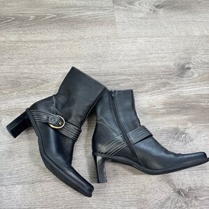 Vintage Eitenne Aigner 90s Jumper Booties, Size 8M, soft black grain leather with gold buckles and detailed stitching, stacked heels, man made soles, great condition.
