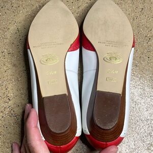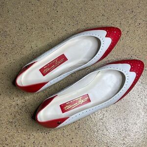 Condition: Worn just once with very light signs of wear including some very light wrinkling of leather uppers, watermarks/dye marks on red leather sections mainly near heels/bottom sides, yellowing discoloration to footbed liners (from age), very light wear to bottoms and heels/heel caps (see pics).