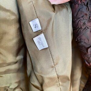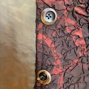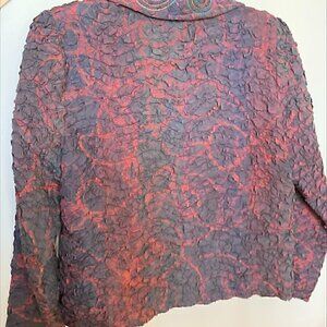 Beautiful crushed silk multicolor, maroon jacket with intricate design by Anna Carlson who is no longer making clothes. Olive green silk lining.
