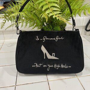 RARE FIND! Iconic vintage black handbag from British designer, Lulu Guinness. Part of the “Glamour Girl” series of embroidered bags, this is the “shoes” in the series “Glamour Girl – Put On Your High Heels” (you can find the “perfume” bag online but the “shoes” version is very RARE). The writing and shoe is stitched in silver metallic thread while the shoe buckle is rhinestones. The zipper closure is chrome with a “LG” script Lulu Guinness logo. The bag measures 9.5 in long x 6 in high x 2 in deep has a satin inside lining in the famous Lulu Guinness black with pearls fabric along with the Lulu Guinness label. The black canvas bag has a black patent leather handle and piping. Dubbed by Vogue magazine as “ladylike with a twist,” Lulu Guinness bags have developed a cult following and are collected and worn by celebrities such as Kate Moss, Bella Hadid, and Sienna Miller. In mint condition, smoke-free home.