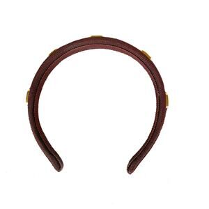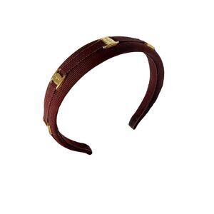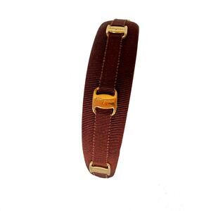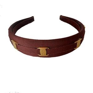 Vintage Salvatore Ferragamo hairband designed with 5 gold-toned logo emblems throughout and crafted in a brown grosgrain.
