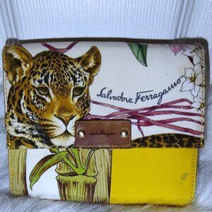 Unique and hard to find vintage Salvatore Ferragamo jungle print compact wallet with a tiger on the front. Very cool piece! It's in good preloved condition. there is wear on the corners (pictured), a very faint stain on the front (blends into the print) and a dark small spot on the yellow. The interior has been repainted and conditioned so it is clean. Not your ordinary Ferragamo!