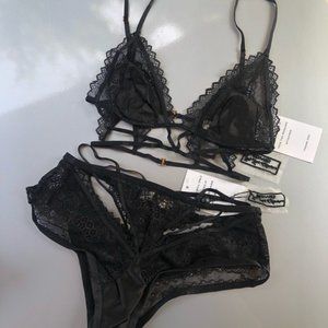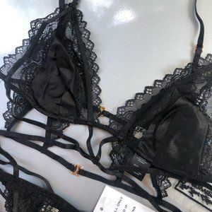 Super soft, delicate 2 piece set from the discontinued Skivvies Collection! This was in the 2016 Holiday campaign. Jet black lace, overall strappy design with strategic cutouts, double hook back closure, golden hardware. Looks amazing worn under a top with a lower cut back! Please note the first 2 pics show the bra but this set includes the bralette instead!