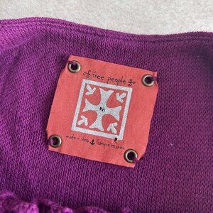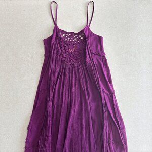 "Mixed fabric dress with asymmetrical hem sweater knit and gauze insets. Crocheted detail along the front and frayed seams all throughout. Adjustable spaghetti straps and gauze tie back. Full adjustable slip underneath. 100% Cotton. Machine Wash."
