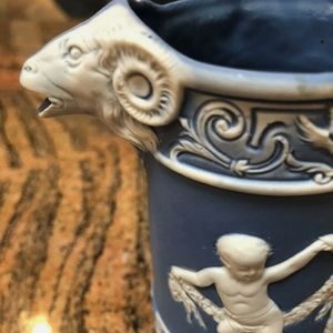 Blue & white parian relief molded with dancing putti on both sides....molded ram's head spout..ornate applied handle.