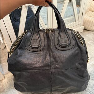 Elegant Givenchy nightingale bag in black leather . Features a subtle texture and branded tag. Measurements are 57-60 cm wide, 34-36 cm high, and 17-19 cm deep this bag is a super rare vintage find with awesome pierced detail on gold hardware