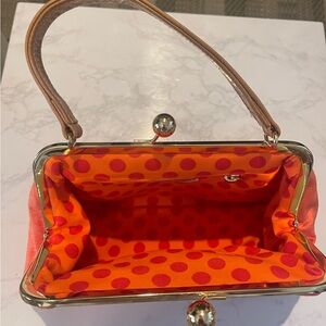 Rare find velvet Glenda Gies coral-salmon orange purse with with brooch and brown leather handle and bottom with studs. Interior is polka dotted canvas like fabric. Gold metal frame with large kiss closure for a classic 60’s elegant look. This piece is in excellent rarely used condition. A lovely addition to your collection.